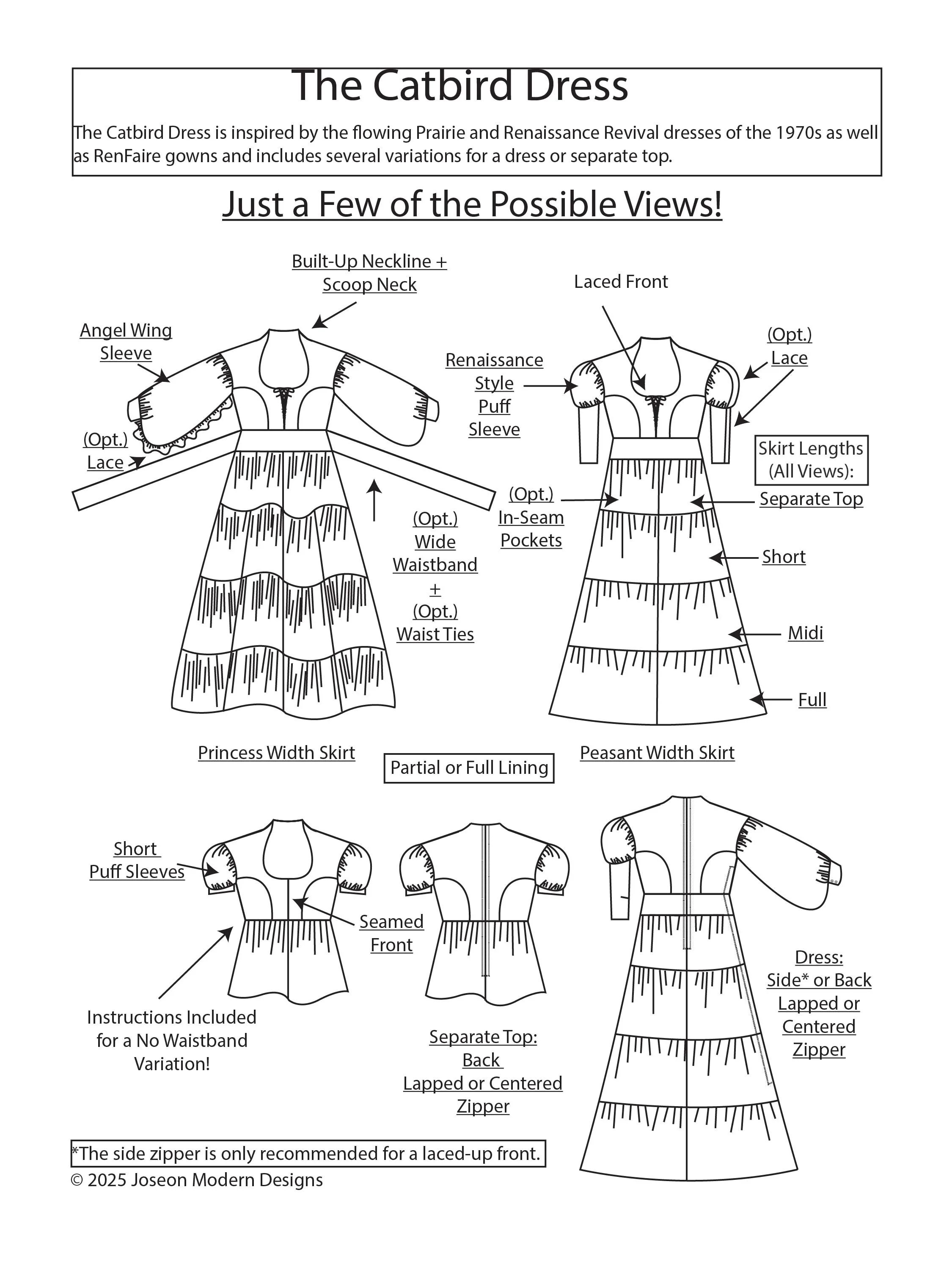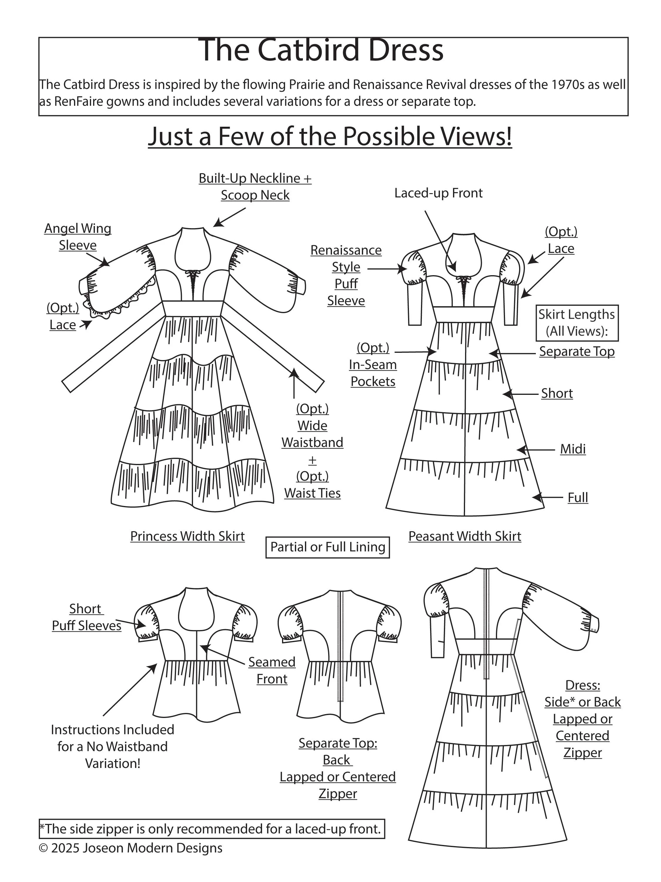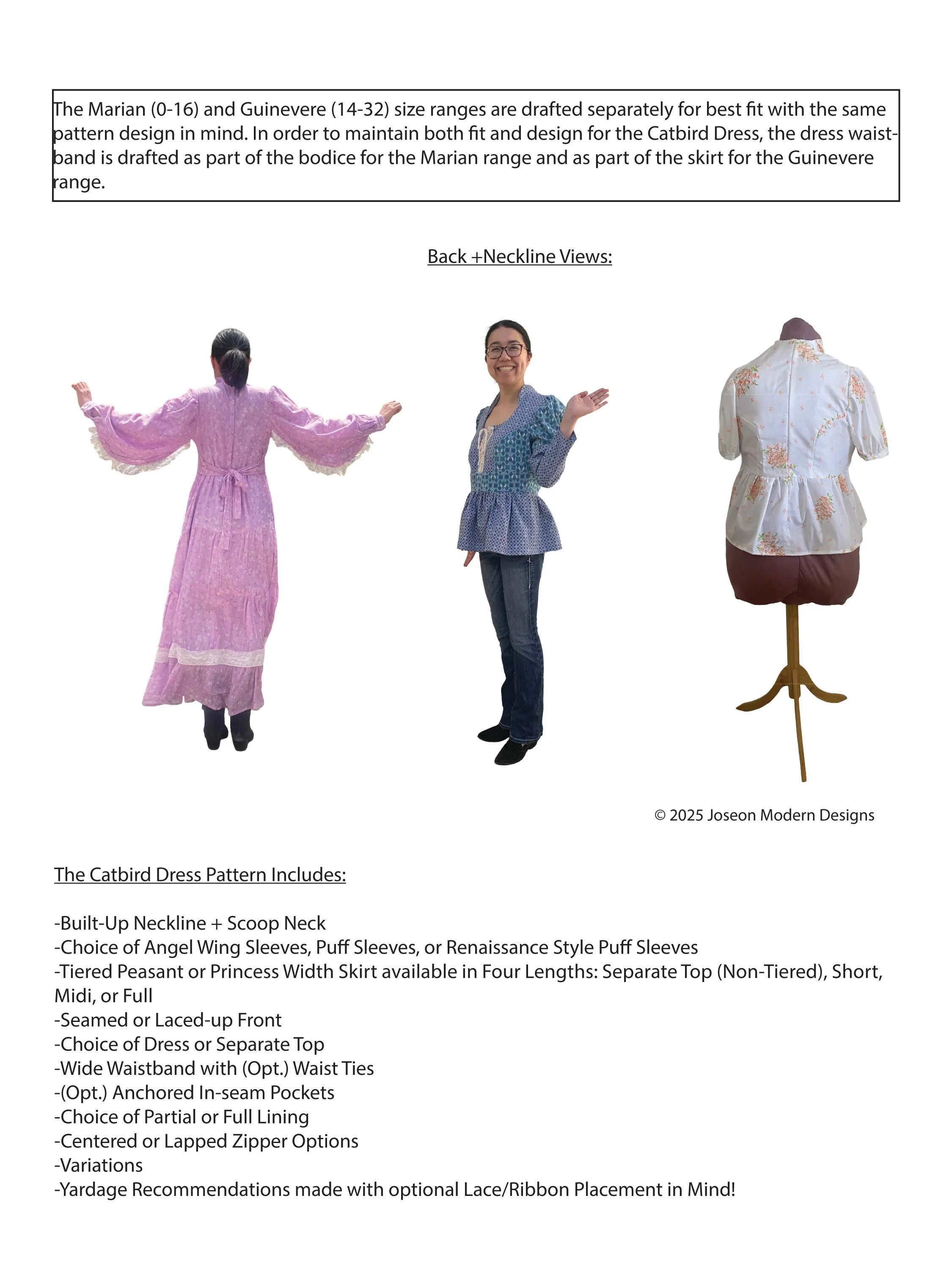 [Alt Text: Joseon Modern Designs Catbird Dress. Marian Sizes 0-16. Guinevere Sizes 14-32. Cups A-G/H. Multiple views available! Three Catbird Dress samples. Interchangeable options with JMD’s Plum Blossom Line. Fantasy/Cosplay. 1970s Vintage Inspired. Skill Level: Intermediate. Illustrated Fitting Guide + Instructions plus layered Letter/A4, A0/Copyshop, and Projector files included. Please feel free to reach out via email at jmd@joseonmoderndesigns.com if you need a more accessible copy or description of any photo!]