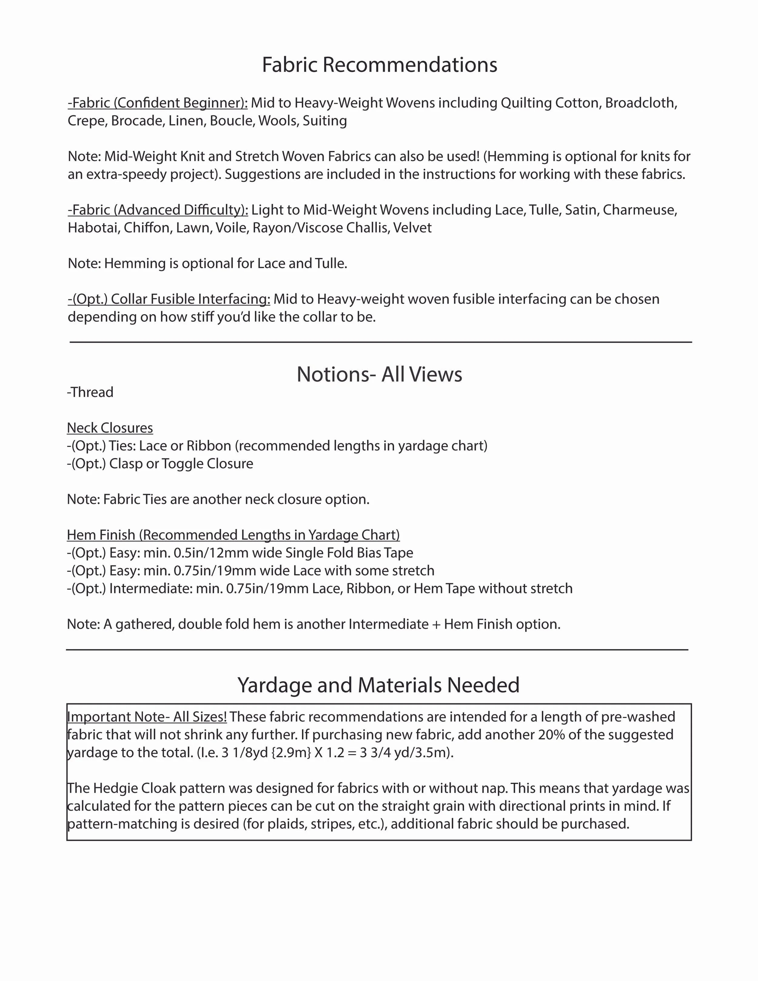 More information, including the notions and recommended fabrics list, yardage, and finished measurement charts can be found below