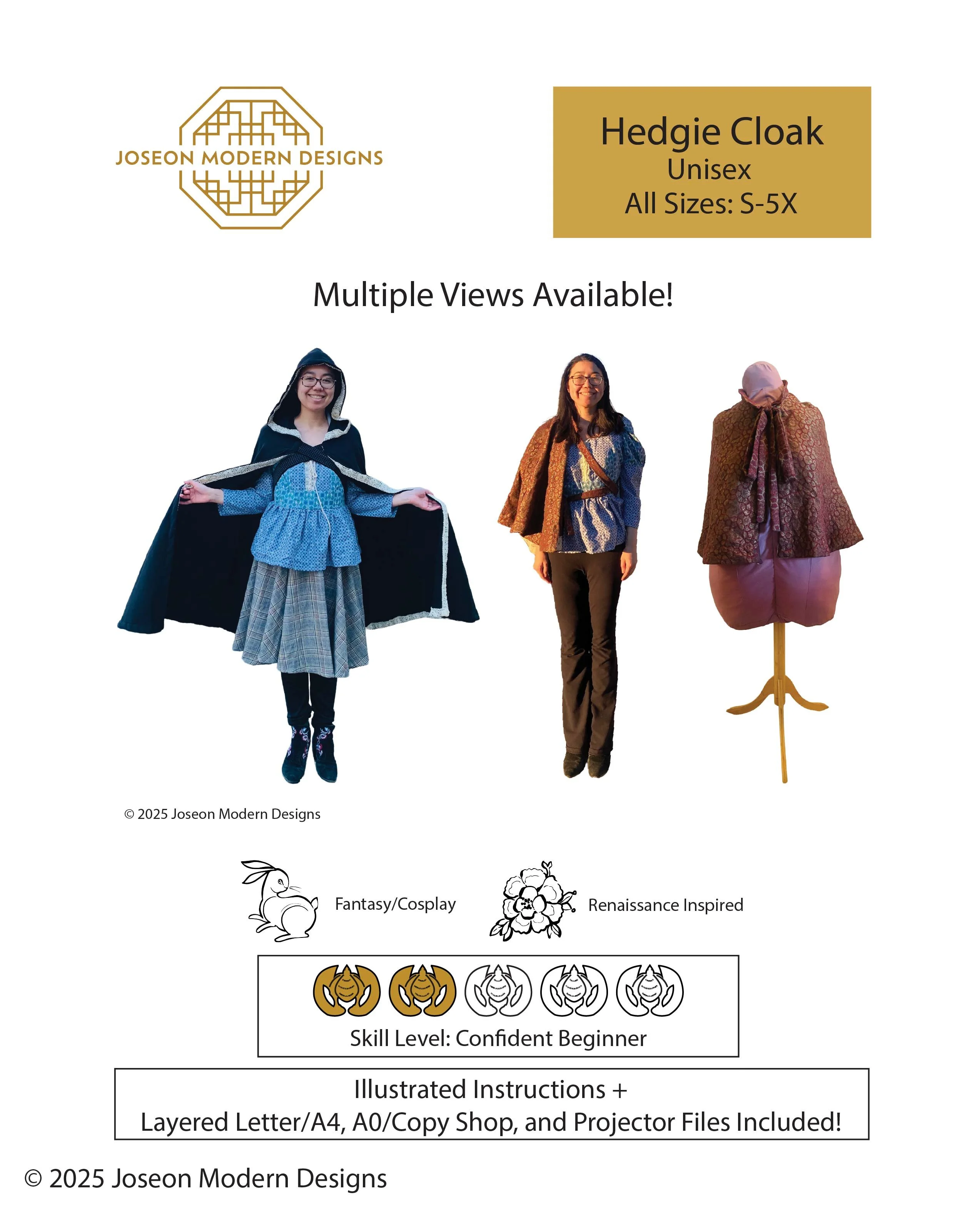 [Alt Text: Joseon Modern Designs. Hedgie Cloak. Unisex. All Sizes: S-5X. Multiple Views Available! Three Hedgie Dress Sample photos. Fantasy/Cosplay. Renaissance Inspired. Skill Level: Confident Beginner. Illustrated Instructions plus layered Letter/A4, A0/Copyshop, and Projector files included. Please feel free to reach out via email at jmd@joseonmoderndesigns.com if you need a more accessible copy or description of any photo!]