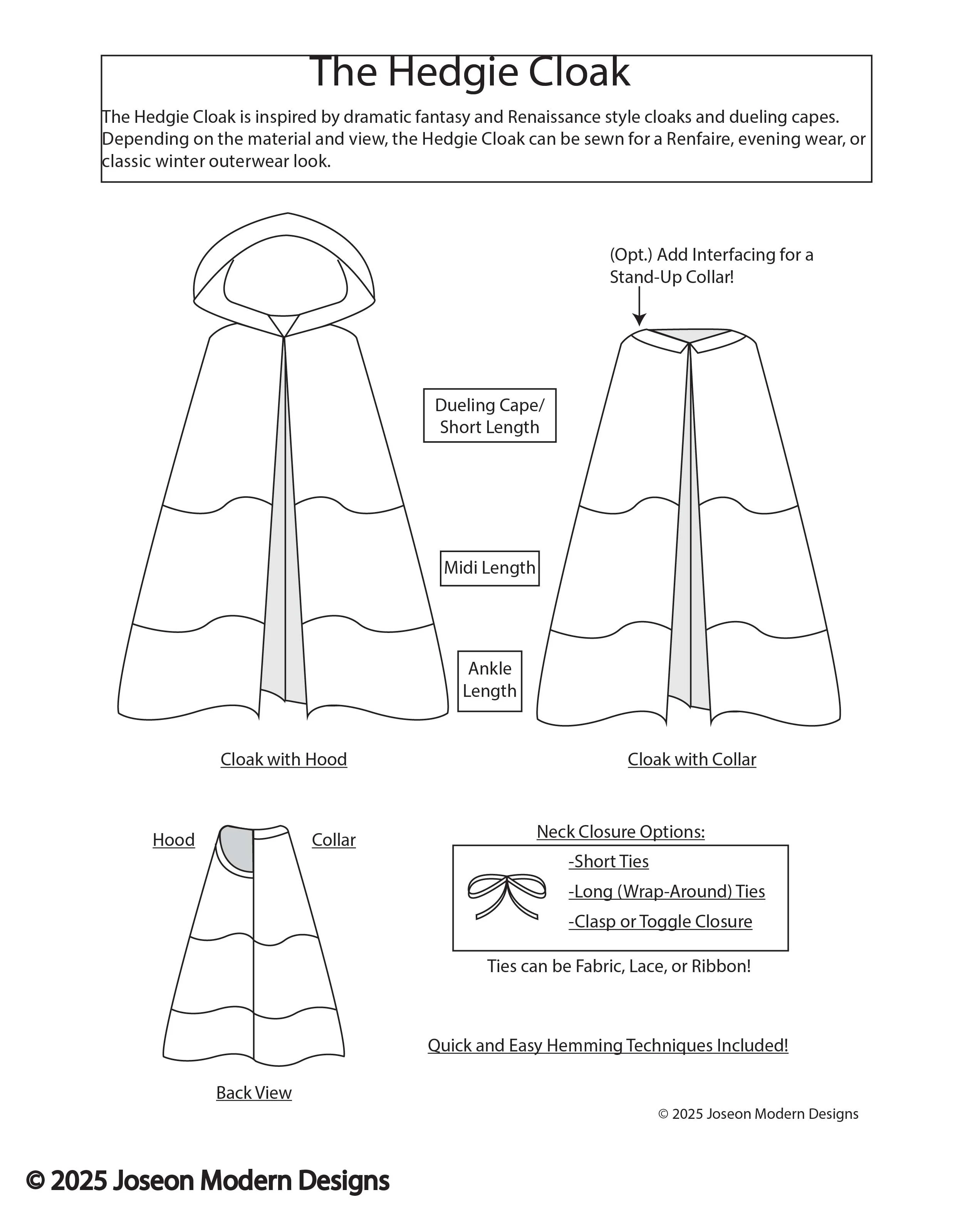 [Alt Text: Hedgie Cloak Line Drawings depicting a few of the possible views. The Hedgie Cloak is inspired by dramatic fantasy and Renaissance style cloaks and dueling capes. Depending on the material and view, the Hedgie Cloak can be sewn for a Renfaire, evening wear, or classic winter outerwear look. Please feel free to reach out via email at jmd@joseonmoderndesigns.com if you need a more accessible copy or description of any photo!]