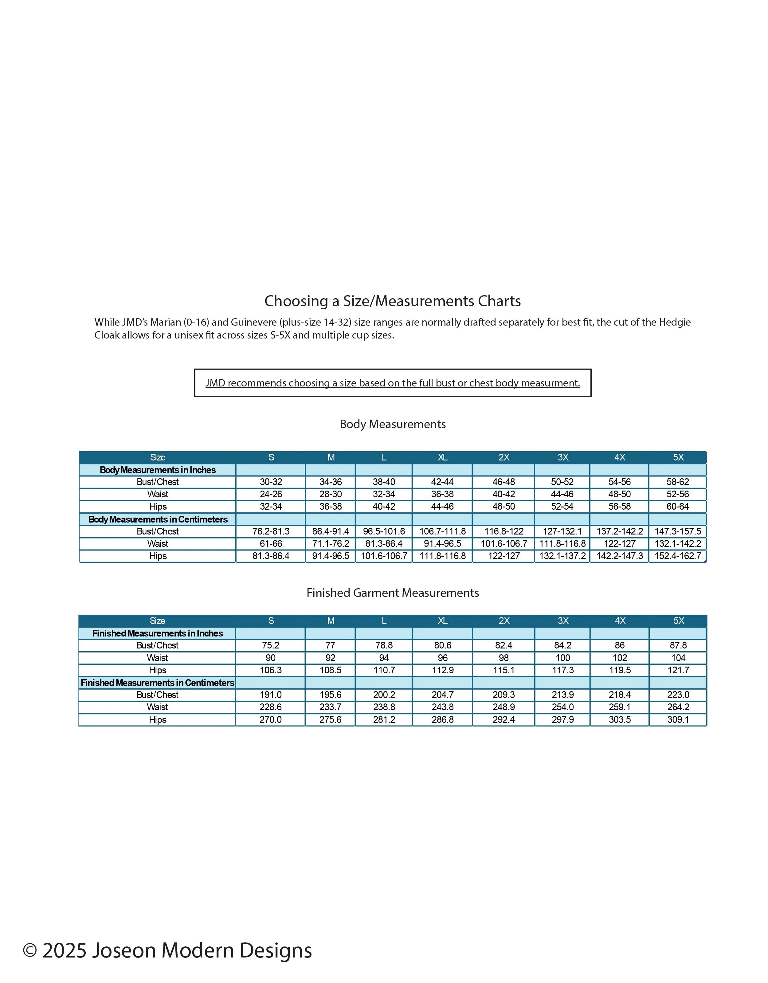 [Alt Text: Choosing a Size. Body Measurements and Finished Measurements Charts. Please feel free to reach out via email at jmd@joseonmoderndesigns.com if you need a more accessible copy or description of any photo!]